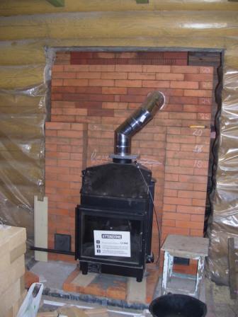 Заказчик поставил в полутароэтажной бане 7х8 факельную каменку (топка из душевой) с водогрейной каминной топкой в зале.