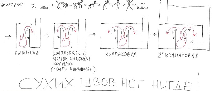 Хорошо, колпак пусть останется... колпаком При рассмотрении колпака значительно превышающего по размерам топку - получим колпак со встроенной в него топкой. Но в этой топке без сухого шва ВСЕ газы ОБЯЗАНЫ пройти над стенкой топливника. Другого пути у них нет. И только после этого они могут разделится на "горячие" и "холодные" если размеры копака позволят. В случае, когда размер колпака сравним с размером топки разделения не произойдет и все газы будут высосаны тягой в трубу. Это уже каналы. Нужно определиться поточнее в терминологии - канал - полость, пространство для движения дымовых газов. Дымооборот - канал для принудительного движения дымовых газов в естественном и противоестественном направлениях последовательно. так вот , в том слечае , когда нет сухого шва осуществляется противоестественный подъем "холодных" газов тягой в верхнюю часть колпака. Это раз. Два, происходить выдавливание-вытянивание "горячих" газов из векрха колпака в подвертку. НУ и в любом случае будет отсуствовать эффект газовой вьюшки, так как тяга трубы будет создавать разрежение, компенсируемое поступлением "холодного" комнатного воздуха через топливник в верхнюю часть колпака. Это три. Если трудно эмпирически представить процессы с газами попробуйте перевернуть все верх дном и "заполнить водой". Мысленно конечно.