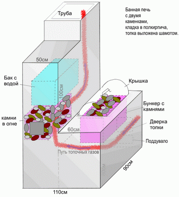 внизу будет заслонка для вентиляции подпола и подачи свежего воздуха на каменку. Справа будет топка из шамота шириной 1 кирпич. Задняя часть топки перекроется в левую сторону листом железа 1,5 см, на нём белая каменка, или кирпичи талькохлорида. газы из топки уйдут влево в закрытую каменку сверху вниз. Каменку планирую сделать для газов вниз и вверх. Думаю, что и левая стенка печи греться будет хорошо без футеровки.