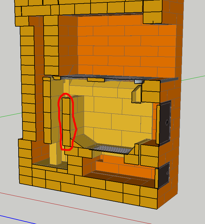 Подьемный будет холодным. Чтобы прогреть заднюю стенку нужно уменьшить по ширине подьемный канал. Разогретая шамотная стенка станет ближе к задней стенке и она должна прогреть внешнюю стенку немного получше. Возможно даже лучше будет еще больше сдвинуть часть кирпичей по верху к варочной плите. Подьемный переменного сечения.