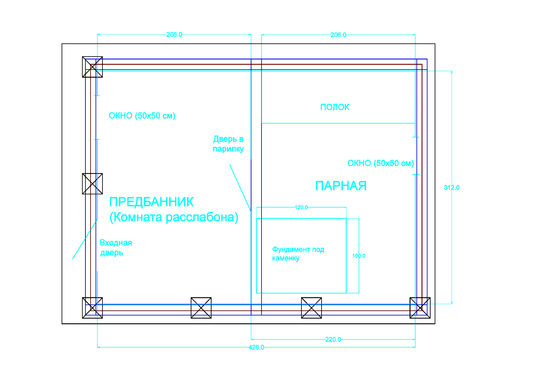 А…Понял. Затупил поначалу, извините. Топка из предбанника, а труба (пардон, если не так назвал) получается самым дальним элементом.
