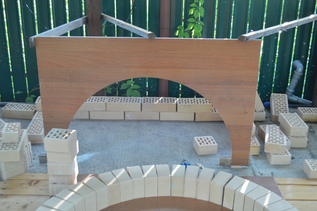 В этот выходной я успел нарезать кирпич, часть сделать клиновым на арку. И начал мастерить шаблон для арки и поставил заднюю часть для удобства кладки плоскости.