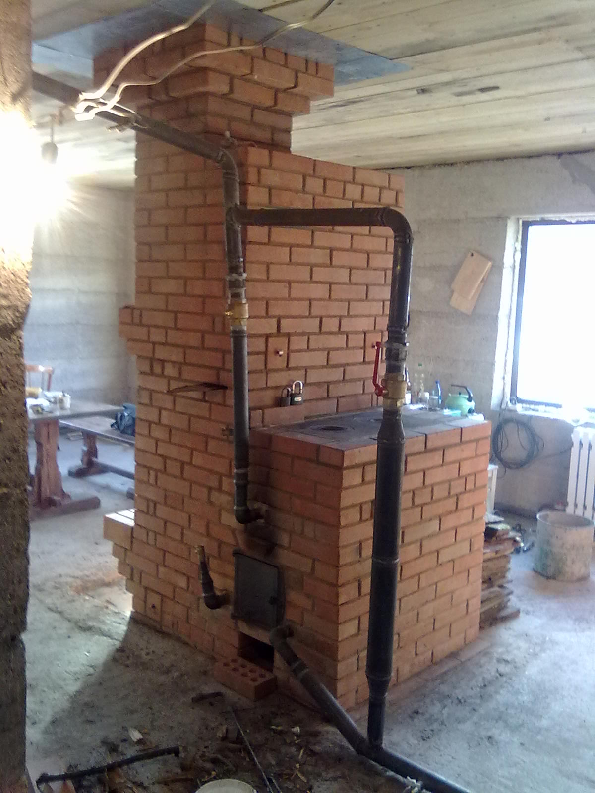 В заключение хочу высказать свое мнение. Пока меня в камине -котле устраивает почти все( не устраивают только ошибки допущенные по не опытности). Печь получилась компактная с котлом имеющим запас по мощности. Не могу сказать , что было бы лучше расположить котел в колпаке или в топке, так как сравнить не с чем ,но я думаю расположив котел в колпаке, такую бы мощность снимать не получилось бы. И при расположении регистра в топке, можно применить режим медленного горения, например на ночь. Ни сколько не жалею что сделал кирпичный котел, на мой взгляд КПД кирпичного котла выше котла чугунного т.к. почти вся энергия от сгоревших дров остается в доме, в системе отопления и массиве печи , а не улетает в трубу, как на КЧМах(но это мое мнение)