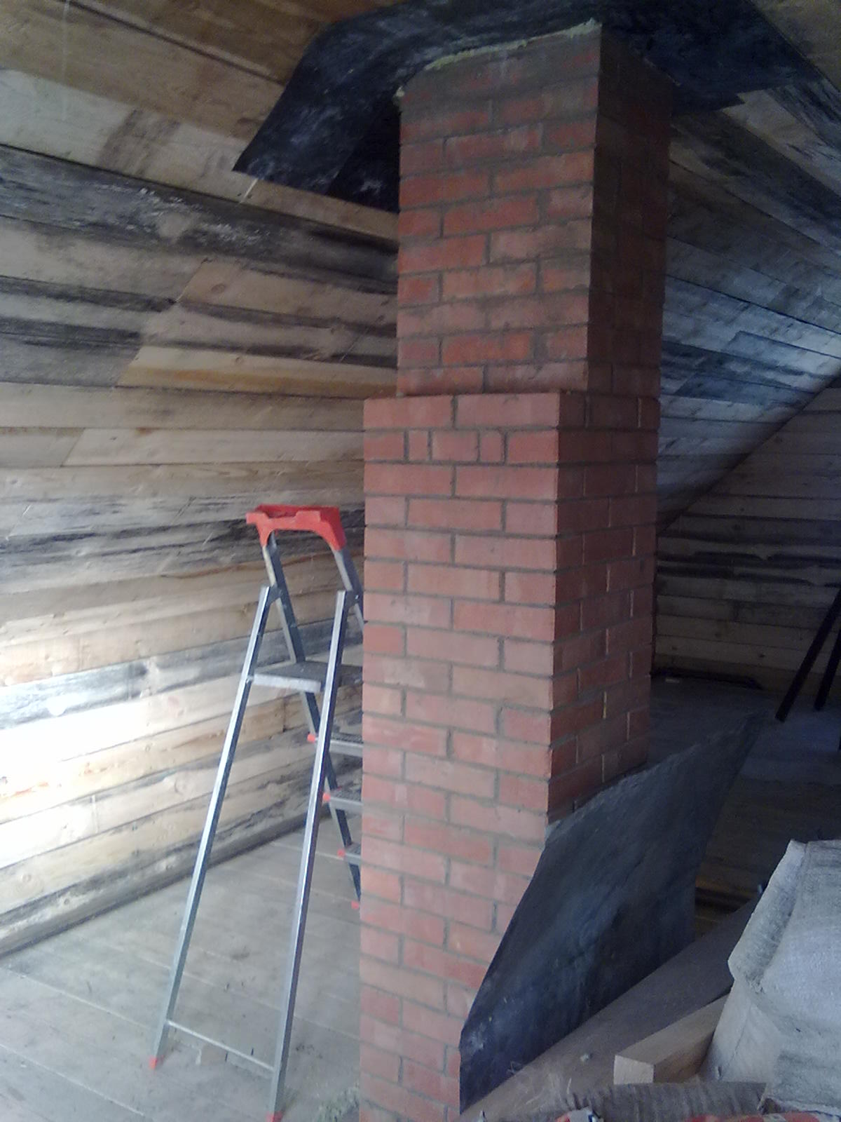 И труба на мансарде, через перекрытие вел в шесть кирпичей , на мансарде перешел в пять, вроде все хорошо.