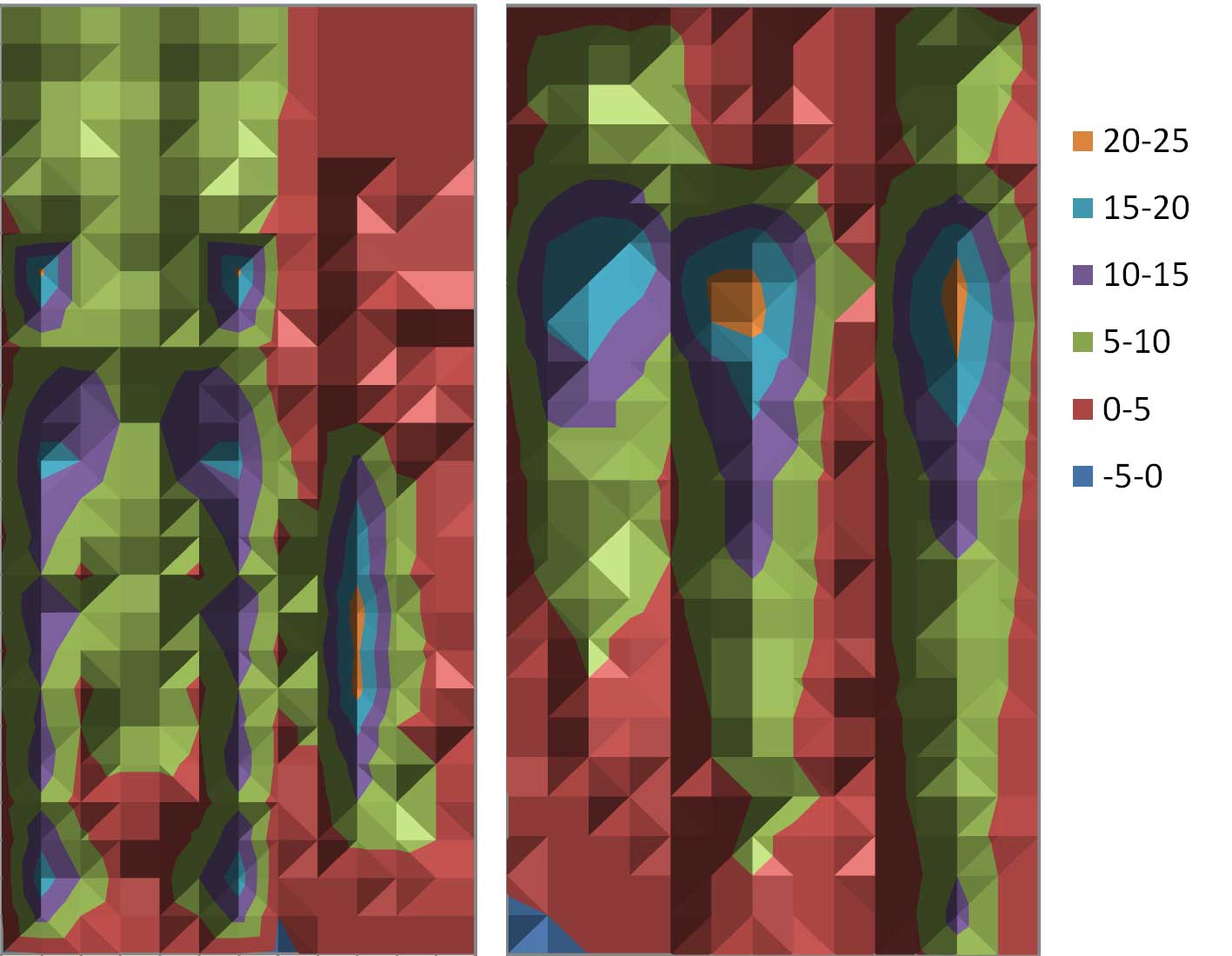 Печь в длину 4,5 кирпича. Условно разбиваю их на половинки, и замеряю пирометром температуру в центре каждой половинки справа налево, занося показания в память прибора на весь ряд. В ряду получается 9 замеров. Переношу цифры в текстовый файл столбиком в формате "ряд столбец температура". После каждого ряда начинаю новый столбик цифр. В высоту я померял 10 рядов. Итого 90 замеров. Далее из этих записей формирую входной файл для программы gnuplot . Она распространяется бесплатно. Пример файла с данными и командами для построения диаграммы во вложении.