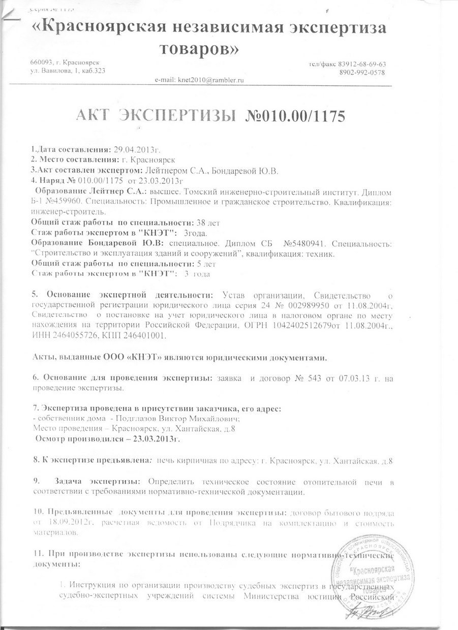 Можно предположить , что экспертиза лишь подтвердила факт разрушения печи и наложила запрет на дальнейшую эксплуатацию . А как проходила эксплуатация, эксперты присутствовали или нет при этом-вопрос... а выходить в суд можно по любой печи с трещинами в кладке-вот самое уязвимое место печника... Далее -по Договору-в течение года Исполнитель не отремонтировал печь, не выполнил своих обязательств и посему должен возместить убытки Заказчика, подтвержденные Экспертизой. Главное в этом вопросе- данные Экспертизы, были ли зафиксированы нарушения Снипа.... Техзадание какое то неопределенное -хотел с варочной -получилась хлебная... При выходе в суд истцом указываются ссылки на действующие законы, на основе которых и выявляется истина. Красноярск грозится судом...?