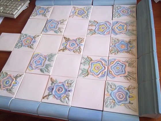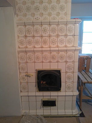 параллельно другими печниками ведётся монтаж каминной облицовки из нашего-же изразца