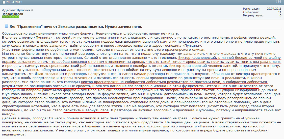 Не надо голословно козырять своими умозаключениями. Вы и так уже пустили заказчика "по ложному следу". Если вы покажите хотя бы один документ, подписанный мной с заказчиком по подряду или проекту на печь, тогда будет разговор. Пока же вы только распространяете заведомо ложную информацию.