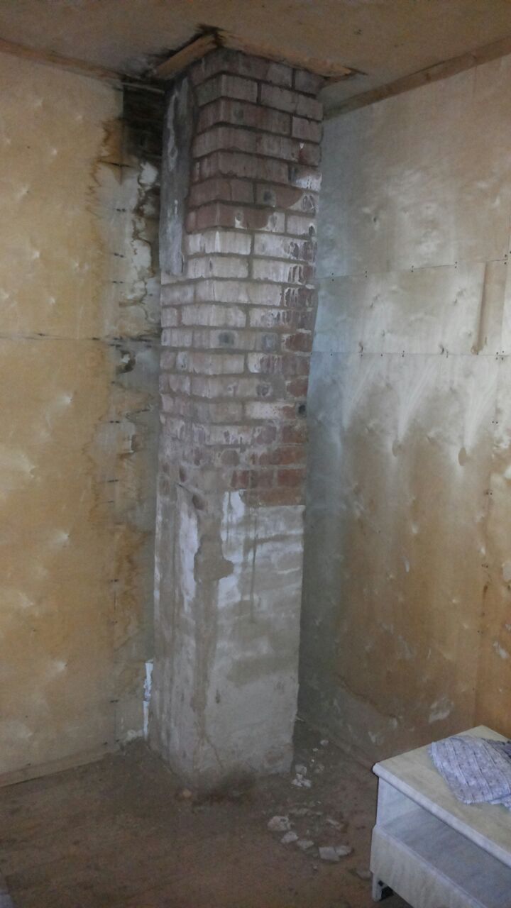 Кроме того, из-за течи с крыши (видимо с места прохода трубы через кровлю) высыпается кладочный раствор трубы на втором этаже.