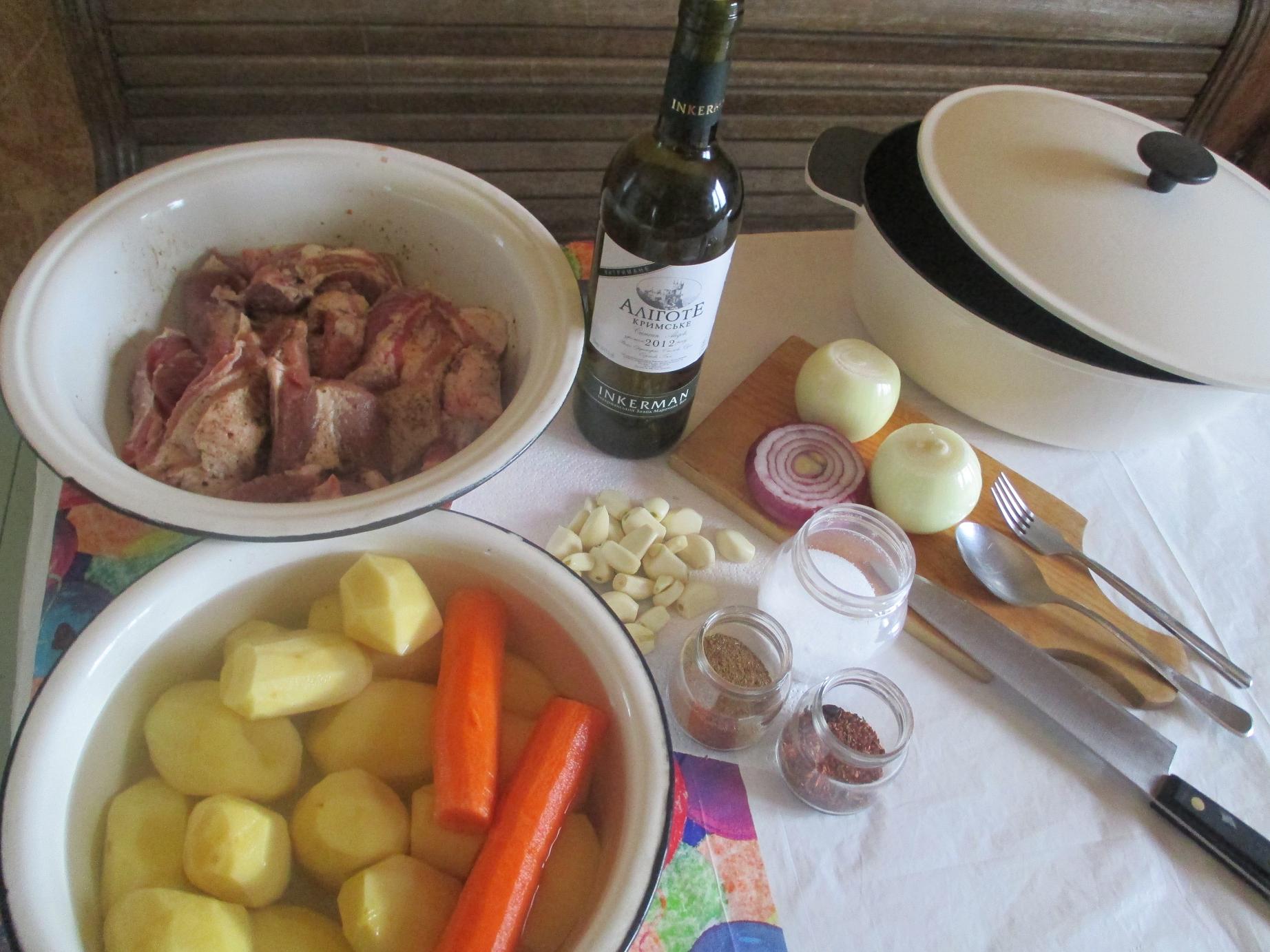 Пока ждал, с сыном, используя беспроигрышный набор (свиная грудинка, картофель, лук, морковь, чеснок, перец...) составили композицию в новой утятнице...залили сухим вином. И ушли кататься на горке...