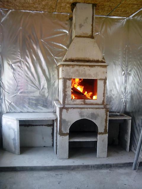 А потом он захотел камин вместо дровника . Пришлось чуть заузить ширину мангала , чтобы сечения для прохода дыма из камина были достаточны , чтобы из дверцы не дымило . Сделали новую топку и теперь камин можно топить отдельно от мангала .