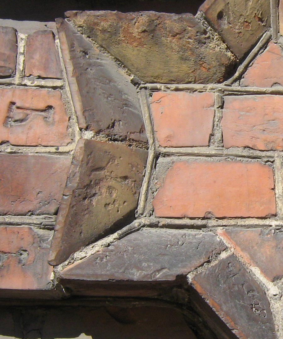 Следы пиления заметил только на некоторых кирпичах, в основном поверхность гладкая, как отформованная. На многих кирпичах клеймо. Раствор с беловатыми включениями, скорее всего извесковый, кроме мест ремонтировавшихся на цементном. Цементный отшелушивается пальцем намного легче чем старый.