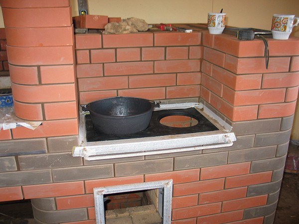 На 13 ряд устанавливают рамку из стального уголка 63X63 мм на наружный периметр. Устанавливают стальную плиту толщиной 15—20 мм с отверстием для казана круглой формы. На плиту устанавливают кольца разных диаметров для установки казанов различных диаметров и размеров. В отсутствии казана плита полностью перекрывается кольцами для установки других видов посуды.