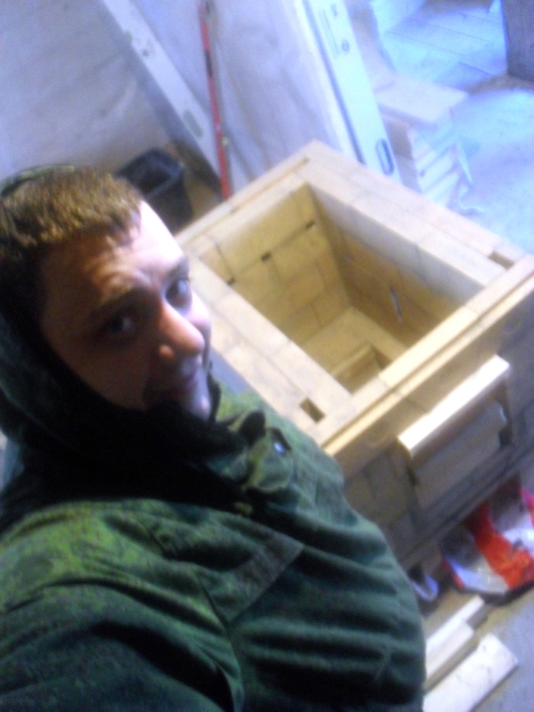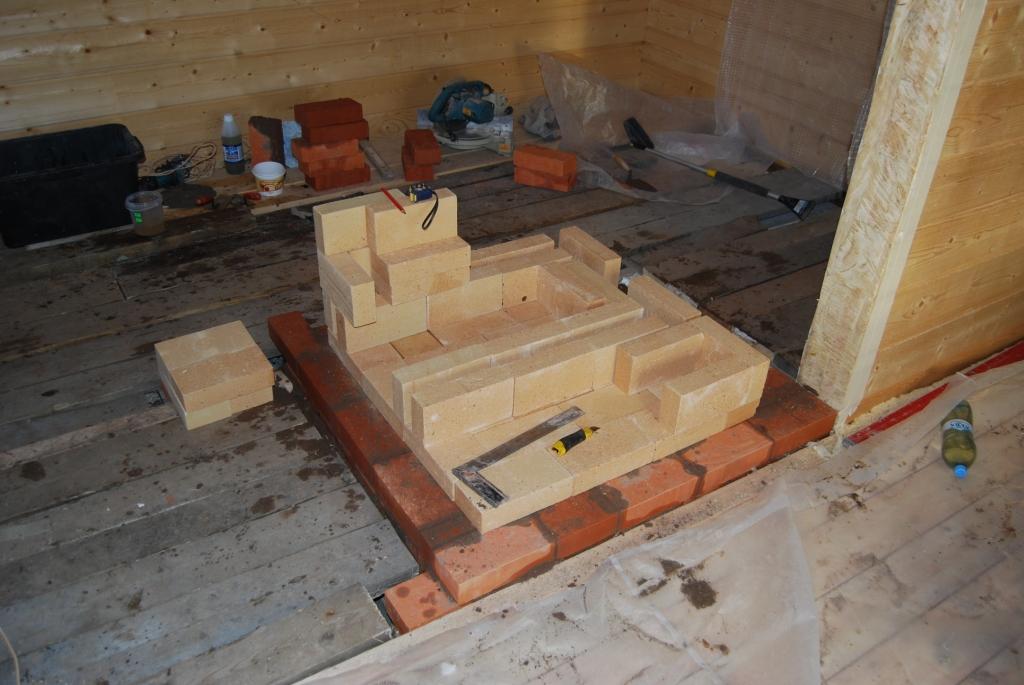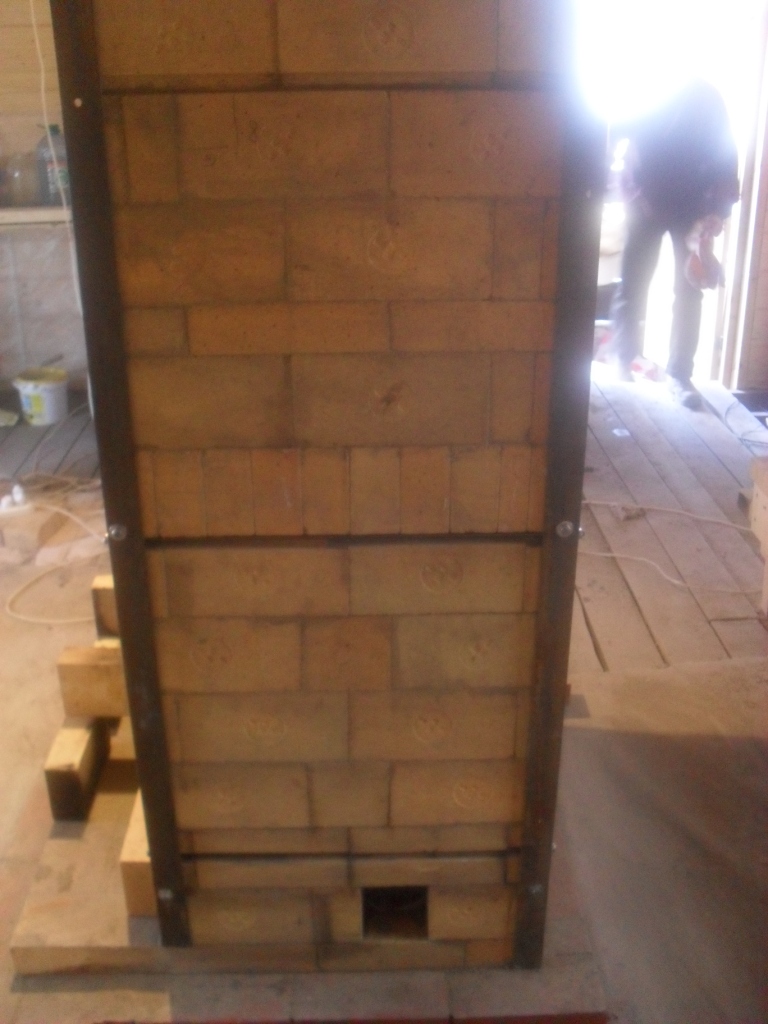 Как всегда, начинаем с шамотного сердечника ( хорошо когда есть такая возможность). Огневой столб будет затягиваться в бандаж, на этой печи решили крепить уголки на шпильки, посему в процессе кладки, делаем выпилы под шпильки в соответствующих местах.