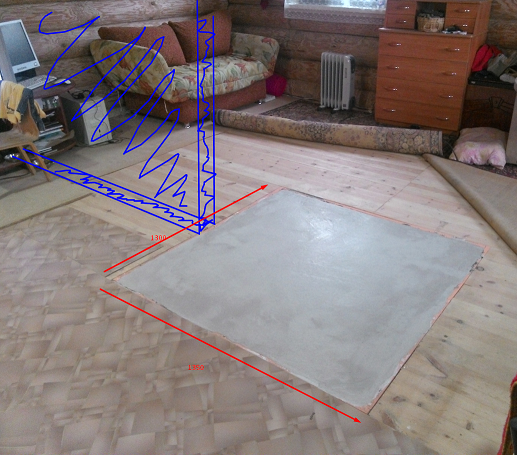 Имеется фундамент 1300х1300 мм. в срубе 6х6 м. Фундамент посередине помещения (на фото). Высота от пола до потолка 2350 мм.