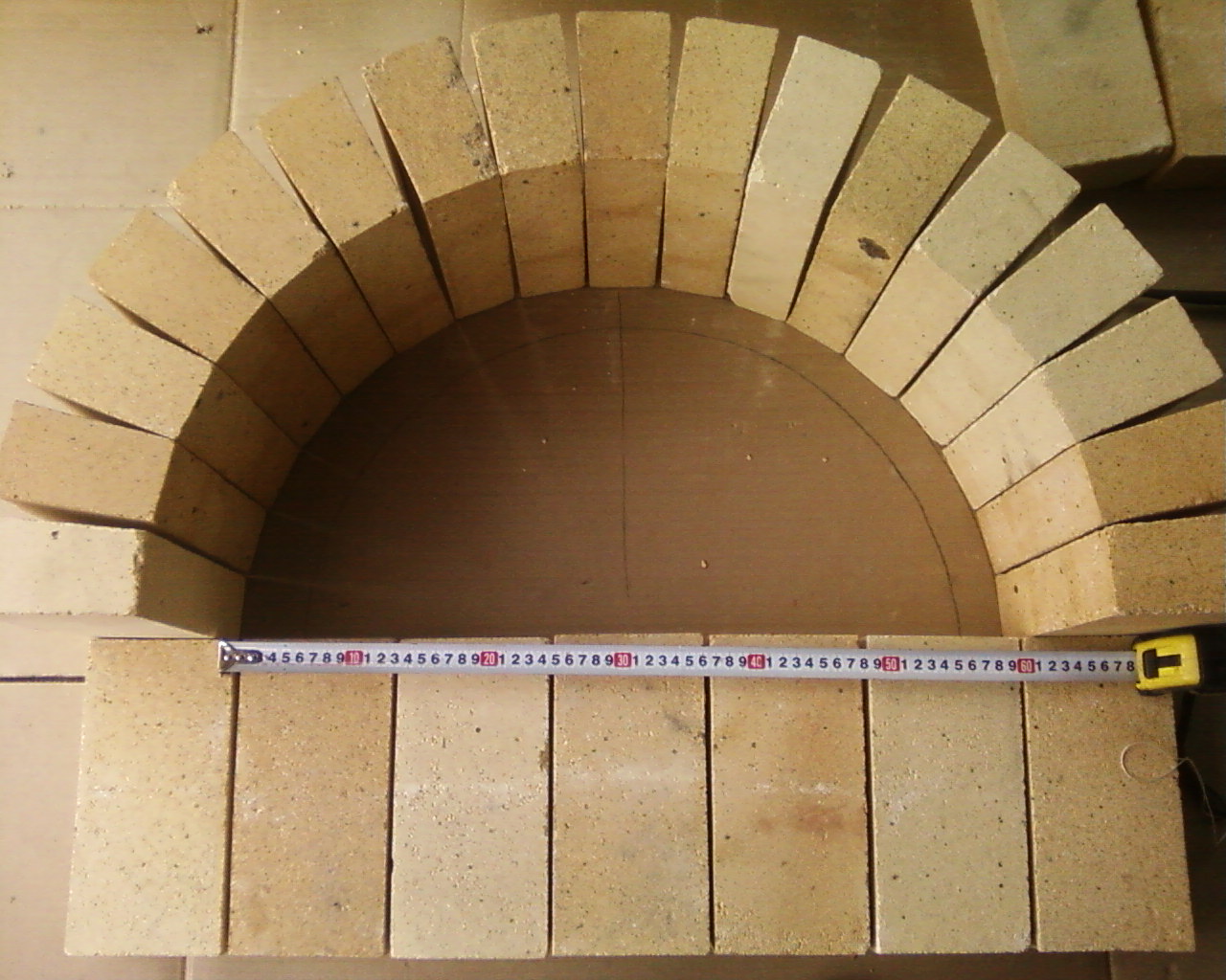 Для свода горнила приобрел кирпич ША-44. Попробовал сложить арку. Получилась с радиусом 300 мм. Но смущают швы - от 0 до 10 мм. Таким образом можно складывать или придется дорезать клин?
