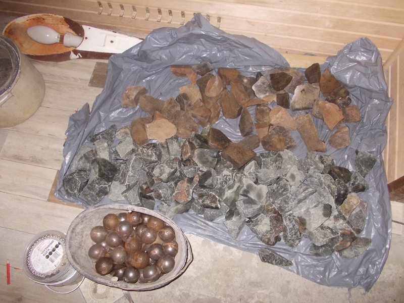 | Закладка 150 кг смешаного камня профирит и малиновый кварцит + 50 кг чугунные ядер . |