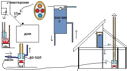 хочю сделать постройку, мастерская плюс баня, печь на базе буржуйки. но как правильно оформить. так же охото пустить горячую трубу в дом. но труба не одна, из дома пойдет отопление и с ними же трубка для горячий воды. какой нужен выносной бак, 1,1*1,1*1,65 хватит?я имею сварочник ресанта220А...