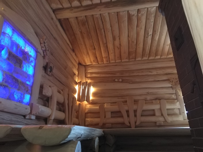 Вот еще одна банька в стиле Лешем. С высоким(диагональным) потолком 3,9 и 2,7м (по диагонали). Объем, стояла задача сохранить.