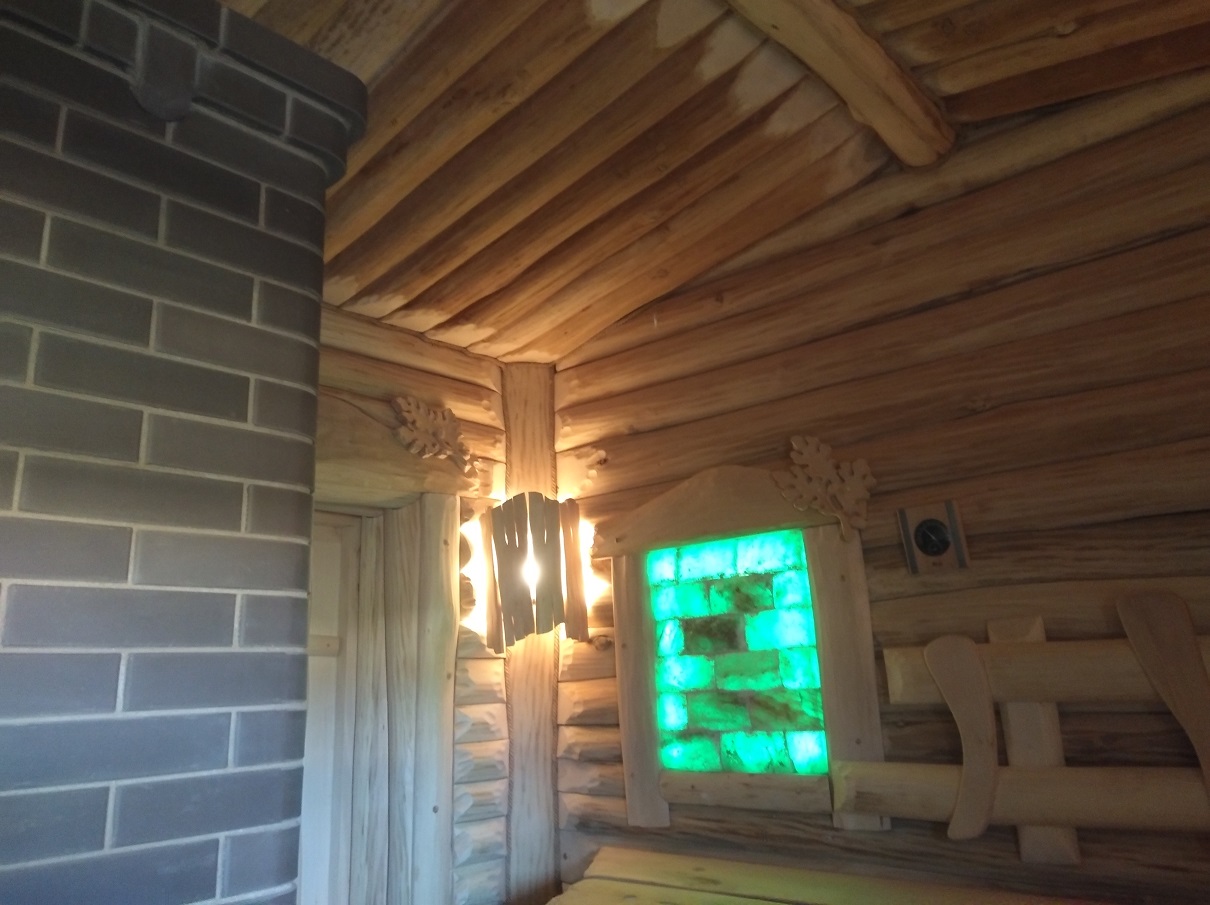 В парной есть слив, окно для проветривания, заведена гх вода, установлено соляное панно.