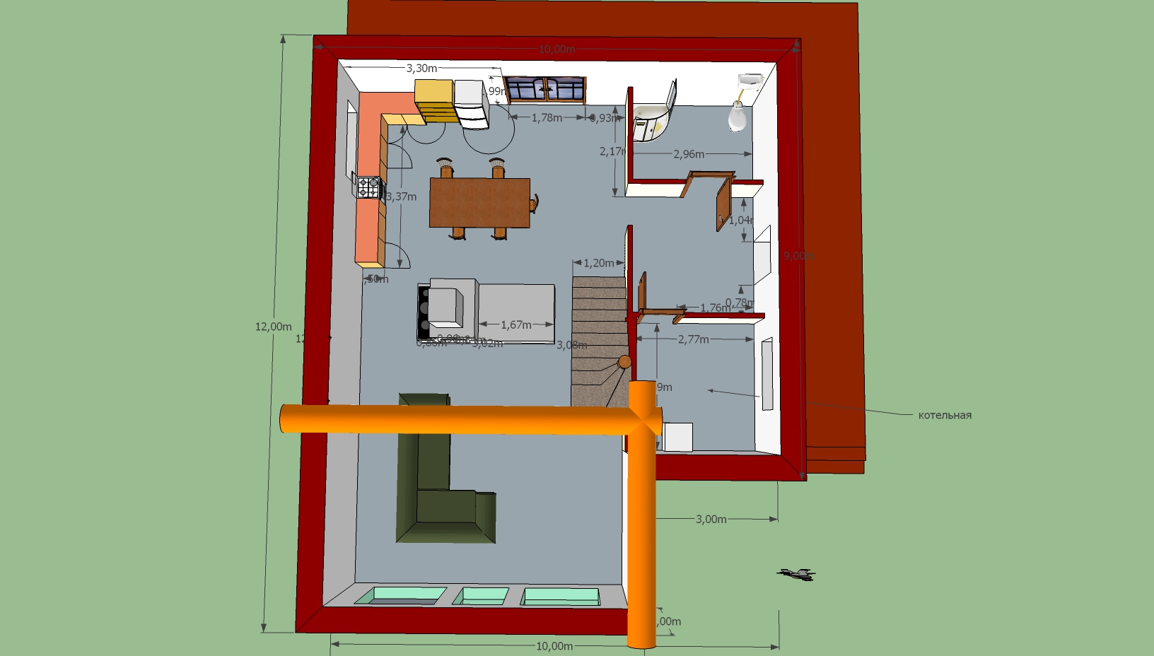 2. Можно так расположить печь в доме +-1 метр, так как труба пойдёт через второй жилой этаж.