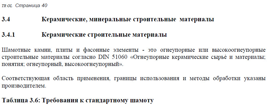 На сегодня камень преткновения - это шамотные изделия, применяемые для строительства печей в ЕС и обозначенные в указанном документе, как приоритетные для строительства. В документе фигурирует, что для каналов с дымовыми газами необходимо применять "шамотные камни, как огнеупорные материалы по DIN 51060