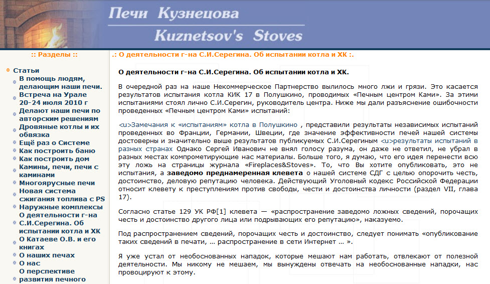 Результат деятельности С.И.Серегина в этом направлении вызывает уважение, так как помогает некоторым людям решить не простые вопросы комплектования собственного строительства печей, однако способы достижения результата, уважения не вызывают. За ширмой благополучия просматривается и негативная сторона деятельности господина С.И.Серегина. Он насаждает в России применение металлических отопительных вставок заводского изготовления, пригодных для использования в качестве дополнительного отопления в наиболее холодный период времени и не пригодных в качестве основного отопления в условиях России.