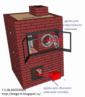 Эта печь самая эффективная из всех печей - котлов в кирпичном исполнении, которые разработаны мною Используйте. не пожалеете. В нем имеется бункер для закладки топлива, камера дожига и газовое окно. Напротив газового окна, сверху установлен теплообменник. Его можно сделать стальным, или из чугунных регистров. Топочная выложена из шамоных кирпичей. По периметру - керамический кирпич, толщиной в кирпич. Исходя из опыта эксплуатации угловой пиролизной печи BLAGO трещин в процессе эксплуатации котла не выявлено. Теплообменник можно снять, не приложив никаких усилий по разборке печи.