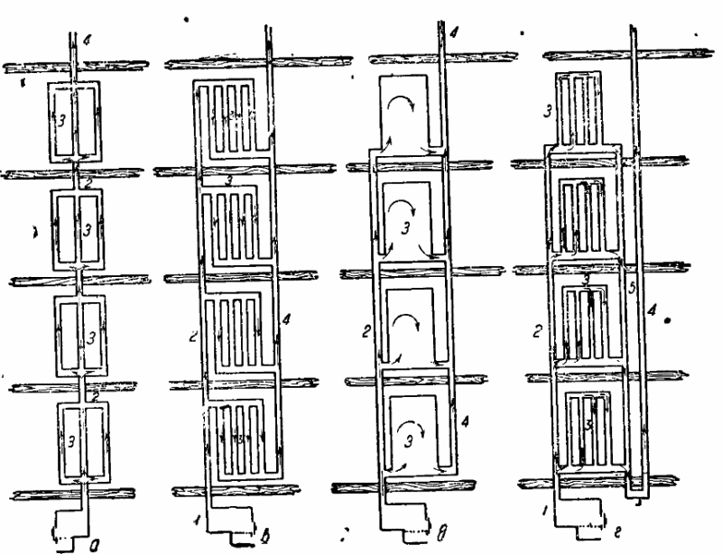 В двухтрубной системы представлена на фиr. 78 Б, В, причем на фиг. Б изображена канальная, а на фиг. B -бесканальная система дымооборотов.