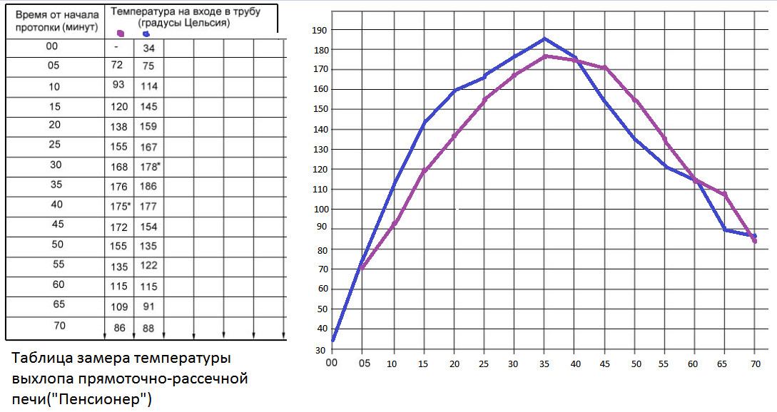 Шура, Вы выложили таблицу температур на входе в трубу. Это важнейшее место в измерениях, показывает сколько тепла улетает в трубу. Так вот, судя по замерам, в печь улетает ровно столько тепла, сколько необходимо по ещё существующим ныне нормам. Этот момент приходится на пик примерно от 30 до 40 минут. В который весьма кстати, наверняка выгорает сажа внутри самой печи, там же, как бы по любому должно быть по жарче. Ну а зола, не сажа, на рассечках много не удержится. Так что рассечки похоже нет необходимости чистить. Только золу снизу выгребай. В целом по выложенной информации, просматривается хорошо сбалансированный выхлоп печи. Э..., может порядовочку с точными размерами между рассечек выложите. Поглядеть на такую печь, что понапрасну теплом не разбрасывается.