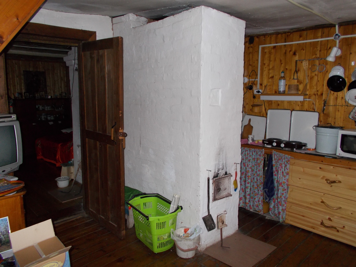 вот фото печей и борова все-таки нашла. Горизонтальная часть борова лежит на двух печах и стене, вертикальная - на печи номер 2. Чугунку ставить, наверное, вместо печи номер 1