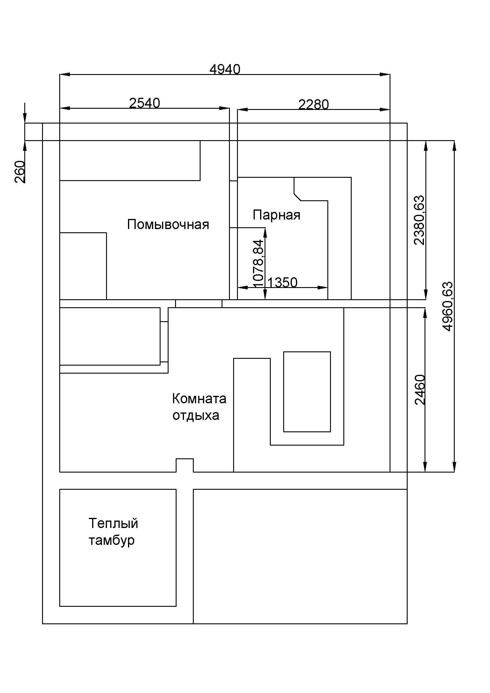 Про прогрев подтверждаю . Был опыт . Сруб 6х4 (внутри) парилка 2х2 , мойка 2х2 , комн отд 4х4 . Печь каменка была расположена в парилке , одна стена в мойке , лицевая в комнате отдыха . Чтобы протопить всю баню при - 15 внутри нужно 8-9 часов .....Сделали проще , зимой ставим в комнату отдыха буржуйку стальную и топим весь сруб за 3-4 часа "до трусов" ......Парилка от каменки зимой грееться 5 часов ...пока стены наберут тепло и массив печи прогрееться .