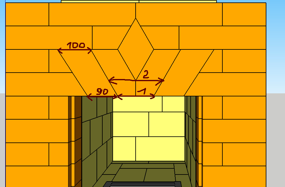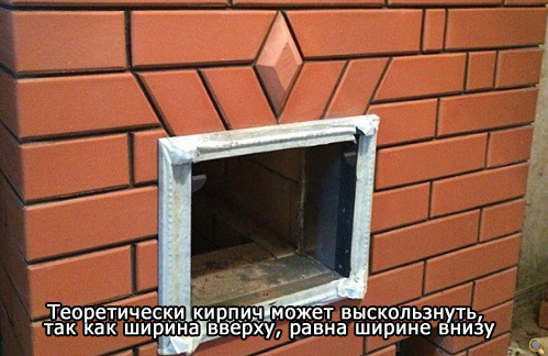 Вы наверное имели ввиду почему в клиновом перекрытии над топочной дверкой крайние кирпичи на ребро, потому что многие делают клинья из обычного кирпича в которых нижняя ширина каждого отдельного кирпича равна верхней, я так делать не хочу. Я же положил 2 кирпича на ребро чтобы снизу было 90мм а сверху 100-110. Мне кажется что в клиновых соединения ширина сверху у КАЖДОГО кирпича должны быть чуть больше чем внизу, чтобы он не мог выскользнуть даже чисто механически. Да я знаю про силу трения и что её как бы никто не отменял но я буду делать так свои перекрытия.