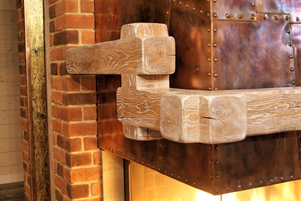 На этот раз не комплекс а камин. Всё остальное традиционно- патинированная медь, медная заклёпка, тонированный дуб, полированный мрамор ,плитка под кирпич ручной формовки . Из нового- витраж в технике Тиффани
