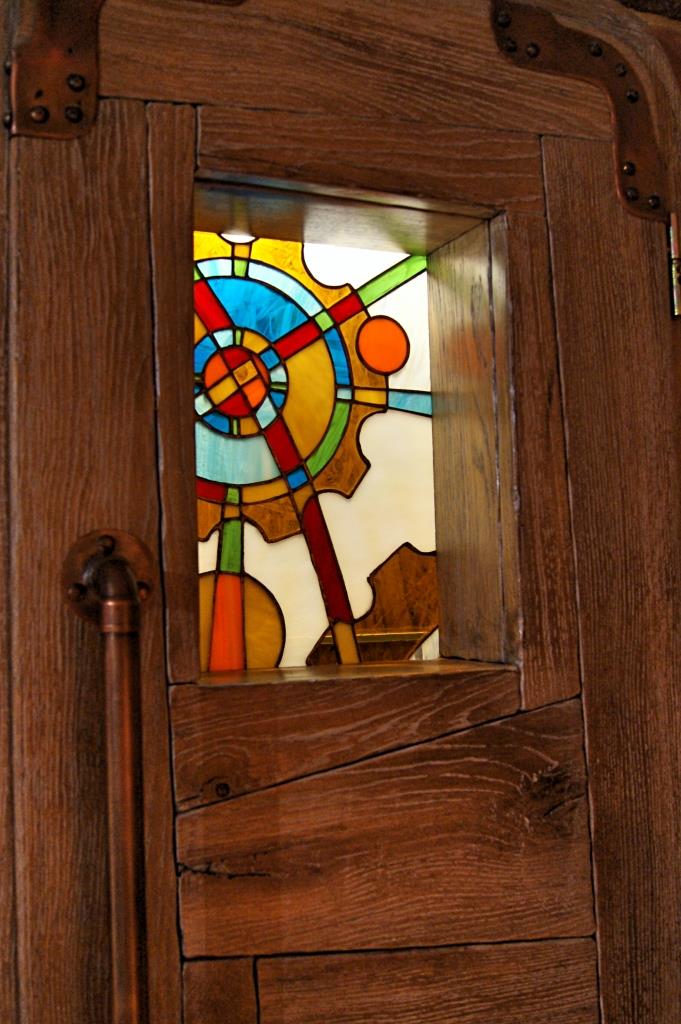 На этот раз не комплекс а камин. Всё остальное традиционно- патинированная медь, медная заклёпка, тонированный дуб, полированный мрамор ,плитка под кирпич ручной формовки . Из нового- витраж в технике Тиффани