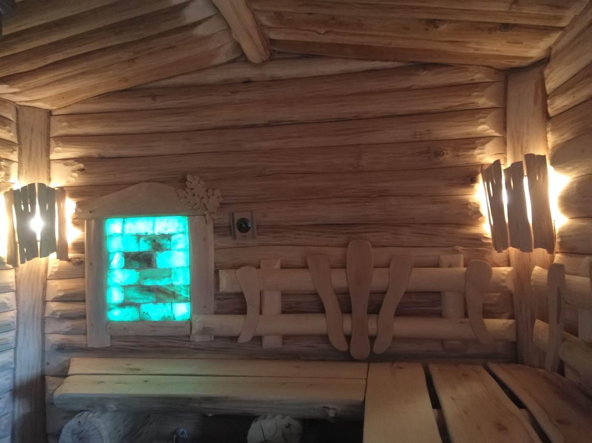В парной есть слив, окно для проветривания, заведена гх вода, установлено соляное панно.