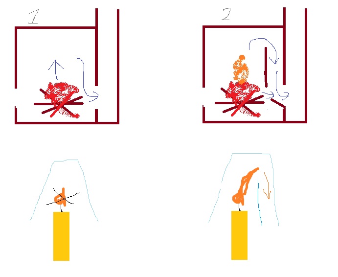 На рисунке вариант 1 - подгородниковский первый колпак двухколпаковой печи. Ниже перевёрнутый стакан со свечёй. У Подгородникова была идея, что колпак будет очень горячий, и эта температура поможет дожигать газы. Но как мы видем на примере свечи и перевёрнутого стакана, свеча погаснет, и вряд ли камера будет что-то дожигать. Поможет только ввод дополнительного горячего воздуха.