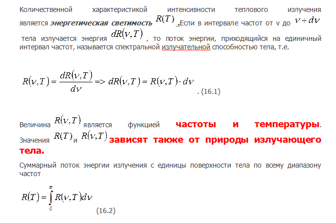 Излучательная способность является сложной функцией, зависящей от природы излучающего тела, его температуры, состояния поверхности, а для металлов от степени окисления поверхности.