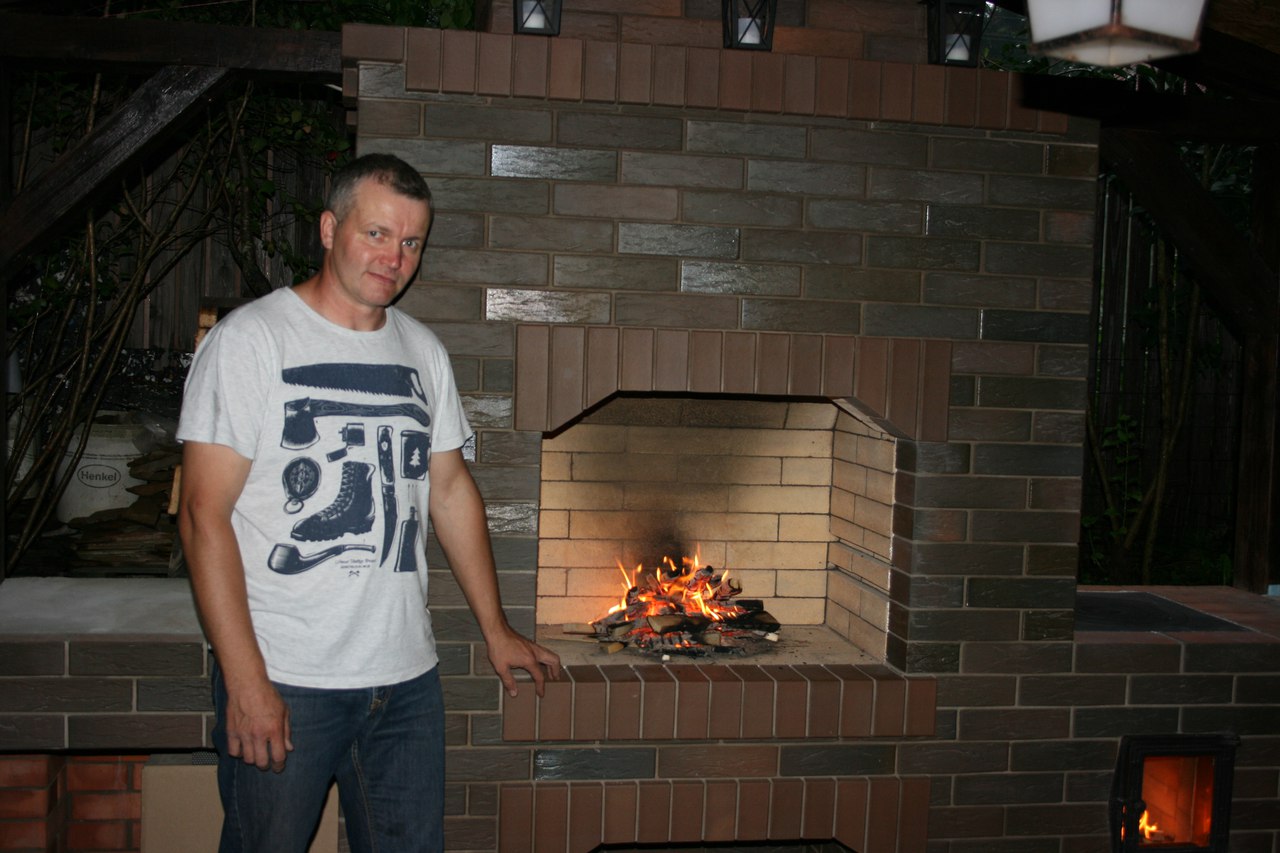 Прошел почти год как наблюдал за ним мангал стоит под навесом все циклы года пока держит .,трубу решился пока с него делать но с гильзой и в коробе. Все напуски и карнизы то что не фасадная часть заменили на коричневую Победу ЛСР так как кирпич покрашен видна краснота это косяк. Пилиться как Кировочипецкий на ура кривой косой до 5 мм разброс углы развернуты -работать можно но много надо калибровать . На фото напарник Илья .