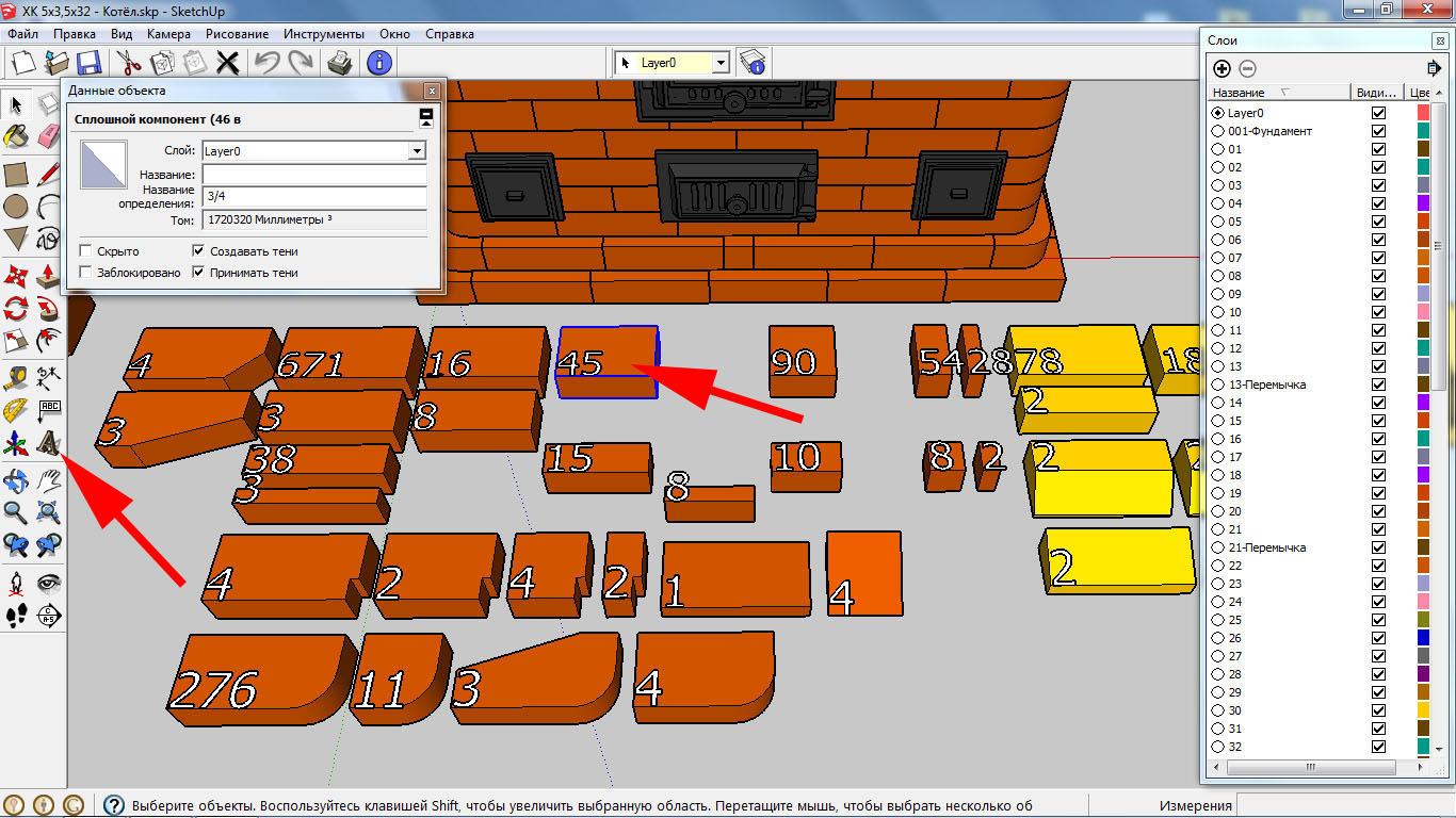 Очень желательно ещё на стадии проектирования подписывать каждый кирпич, например, как на снимке, тогда в окошке статистики будет видно сколько деталей, какого они размера и где находятся.