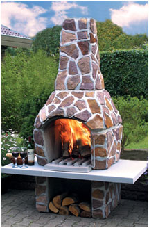 Лепят поделки из пластичного материала. На приведенной Вами фотографии скорее всего монолитная конструкция, облицованная камнем. Камень клеится либо на высокотемпературные пасты, либо даже просто на цементный раствор. Нагрев внешней поверхности такой конструкции не должен быть значительным.