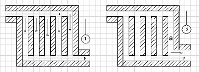 схема 1 сконструирована плохо, т.к. каждый из дымооборотов испытывает различное сопротивление газовому потоку. Такая система будет прогреваться лишь в левой части;