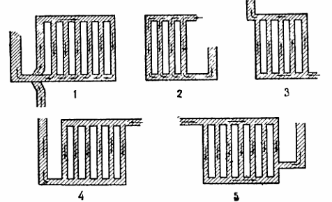 Кроме направления на равномерность распределения газовorо потока oгpoмнoe влияние имеет равномерность длины путей частиц газов по различным каналам. Например, устройство системы опускных дымооборотов, показанное на фиг. 2, неправильно, так как путь для газов по каналу А короче, чем по друrим каналам, и большая часть газовоrо потока устремится сюда, как по пути с меньшим сопротивлением. К сожалению в этом отношении во мноrих конструкциях печей встречаются погрешности, вследствие чеrо стенки печей наrреваются неодинаково.