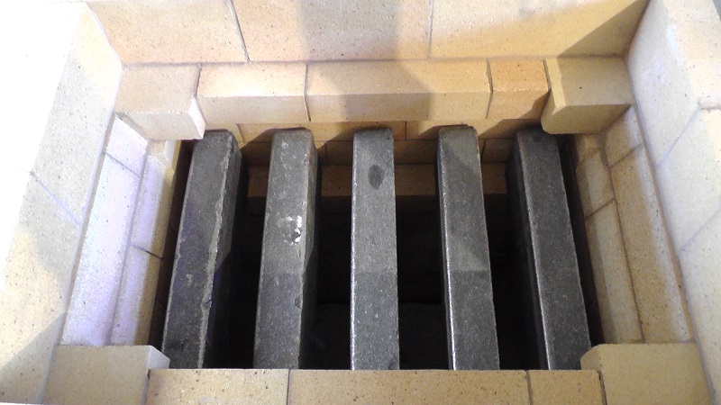 1. На первый ряд укладываем чугунные балочки ( кирпичи) размером 60х120х380 мм: 5-8 шт., расстояние между балочками 4-5 см. Марка чугуна желательно ЧХ-16, но можно и обычный серый чугун марки СЧ-20. Этот ряд воспринимает тепловую нагрузку. Балочки лежат свободно.