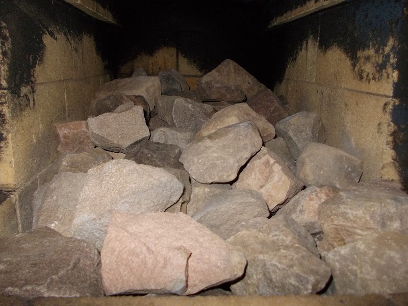 Выложить чугунными ядрами дно каменки. На ядра рекомендуется уложить специальные природные камни для бань и саун (жадеит, порфирит, дунит, хромит, нефрит и другие) в смеси с остатком чугунных ядер (отношение чугуна к камню должно быть ориентировочно 30/70 в пользу природного камня).