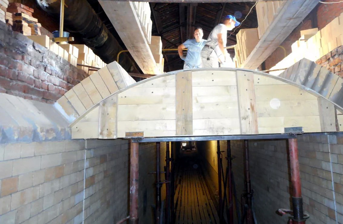 мы вели разговор про кольцевые печи-где совершенно другой вариант эксплуатации- которые загружаются углем через шахты свода и пламя горит по всему обьему- но три восьмерки- сделал вброс фото -которые не имеют никакого отношения к бытовому печестроению ??? На 1 ом снимке-это сушильная зона туннельной печи- на маршруте которой подается горячий воздух для испарения влаги из сырца ! Круглые отверстия для подачи этого воздуха отчетливо видны по обеим сторонам стен ! На этом отрезке не применяется огнеупоры - ибо слишком большая влажность - а техника кладки отличается от камеры обжига ! На втором снимке- это зона охлаждения изделий- точка рассчетного отстоя-на это указывает то- что нет напуска стены с обеих сторон над тележкой- этот напуск делается только в камере обжига и не позволяет высокой температуре достичь колесной пары и рельсов и предохраняет их от перекала ! Третий снимок- это финишный отрезок камеры обжига- но не самой камеры- именно в камере обжига необходима тщательно продуманная технологическая цепочка из огнеупорных технологий ! И только там присутствует температура до 900 градусов-она достигается расположением форсунок по обеим сторонам камеры с шагом примерно полтора метра до 13 с каждой из сторон- в зависимости от длины этой камеры !