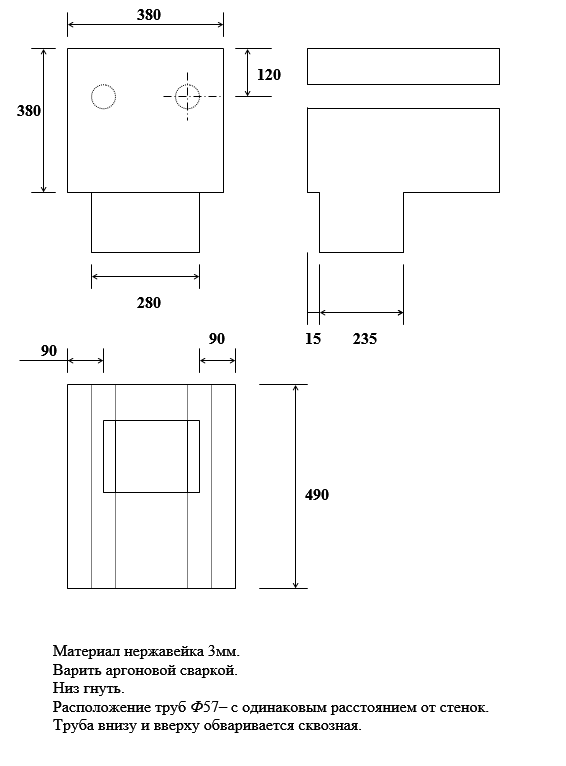 Поэтому делайте топку прямоугольной формы кратно кирпичу с отступом до бака 60-120 мм от боковых стенок печи. От колосника до дна бака не менее 500 мм.