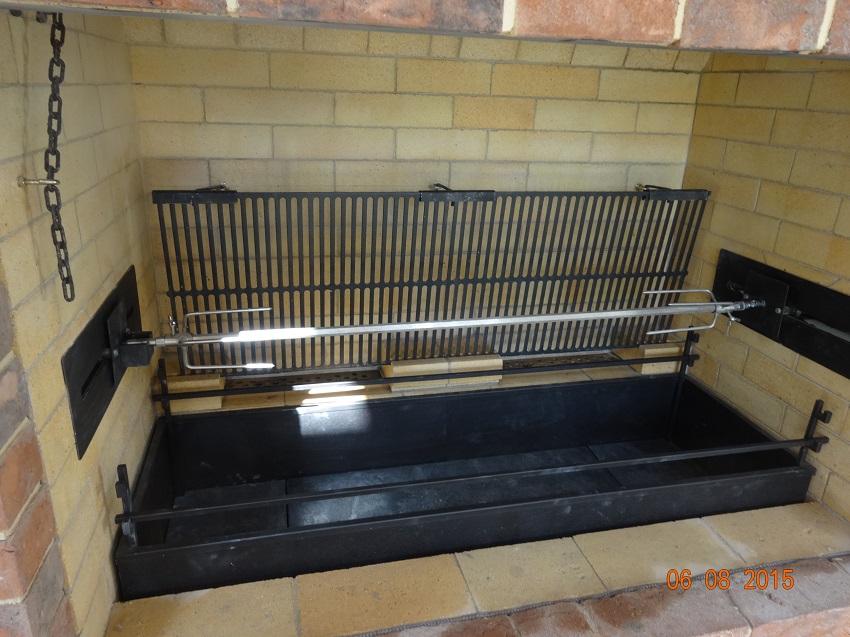 Задняя, вертикальная загрузка дров - понятно, способ давно и многими проверен. "Сила жара" при этом регулируется подкладкой дров вручную. Мы предложили вертел "горизонтального хода", имея ввиду, что возможности регулирования температуры облегчаются. Сделал его "Кулибин", на основе просто пожеланий.