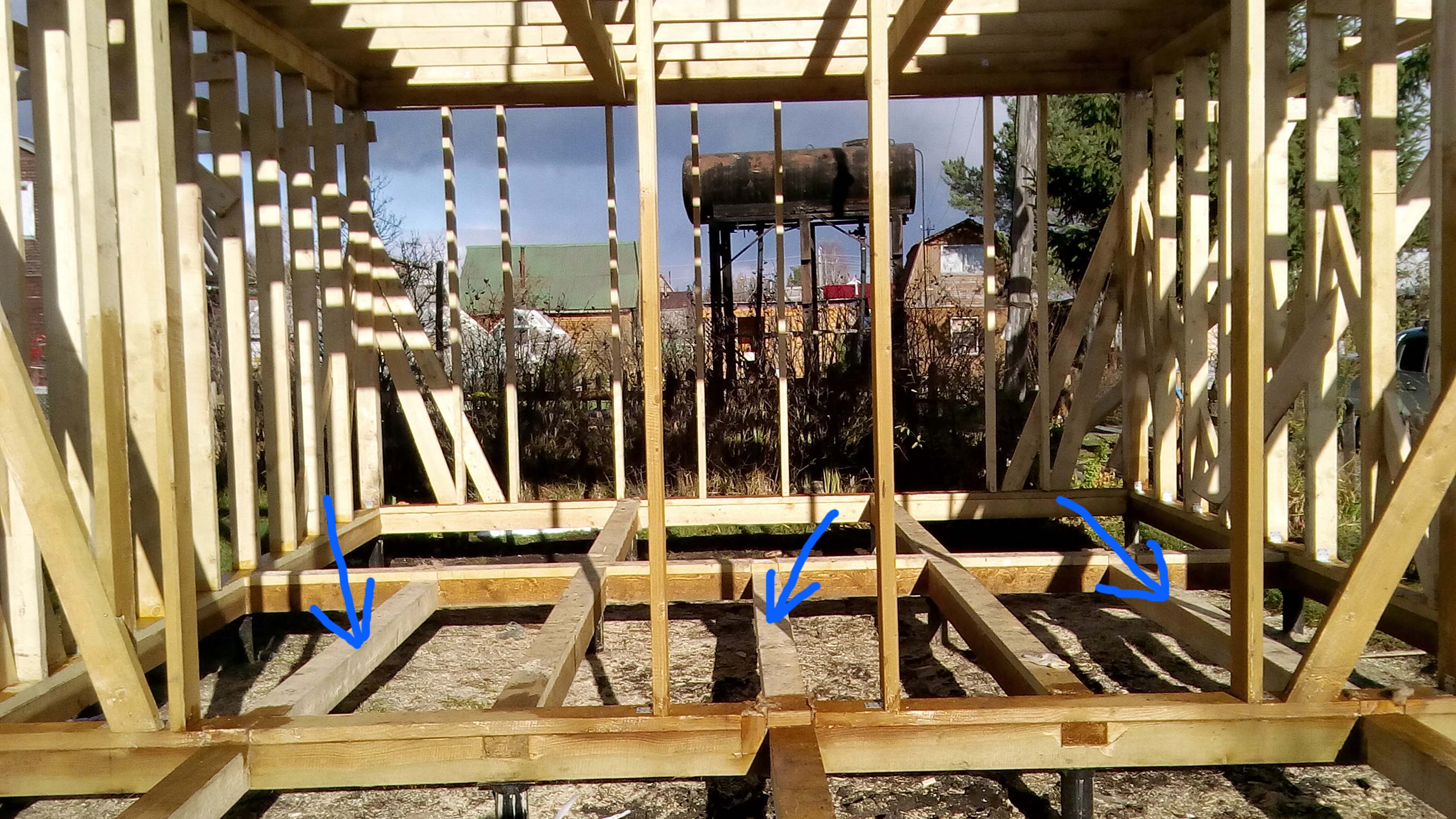 На фото (начало стройки) ещё не законченный каркас и нет печного свайного фундамента, Но сделан был примерно на этом этапе, зеленым выделил примерно где он сейчас, красным точка давления веса.