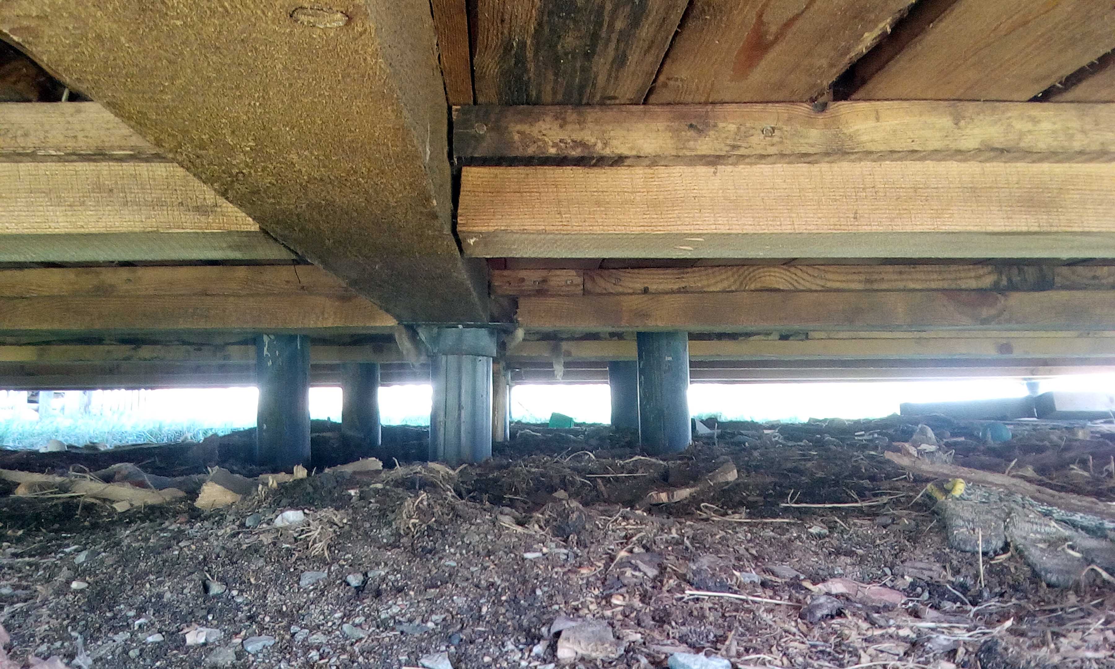 ощущение. что ошибка при сборке каркаса, половые лаги по фото без врезки. Придётся вам таки подпорку ставить